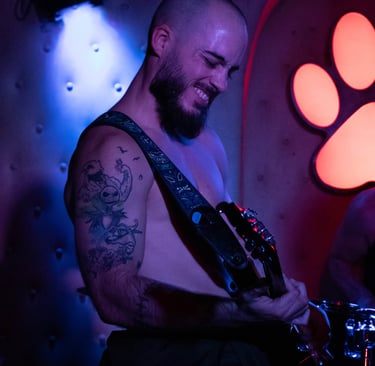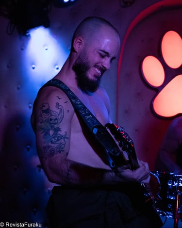 Luigi, con el bajo, bajo la luz roja de El Perro