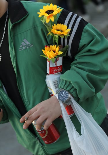 'Ramo' de flores amarillas hecho con una lata de cerveza y un paquete de tabaco