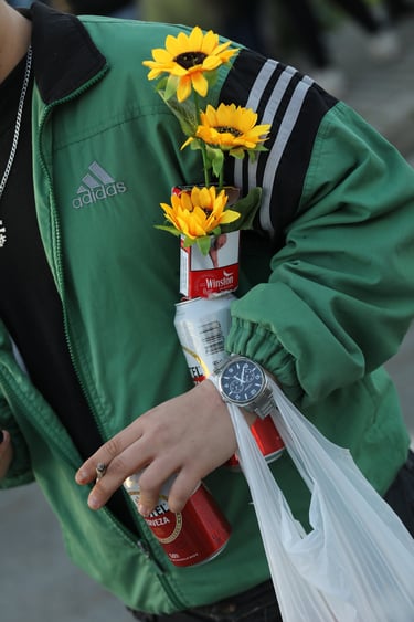 En esos 700 metros el aire es denso, las canciones pesan, las palabras vuelan, la gente ríe, llora, se abraza, se mira, habla, sale, bebe... Aparecen guitarras en rescoldos de hierba, otras en cemento, pequeñas multitudes se congregan para cantar y celebrar. Por todos lados hay flores amarillas, quizá en busca de un agujero en que caer, en busca de una estrella que mirar.
